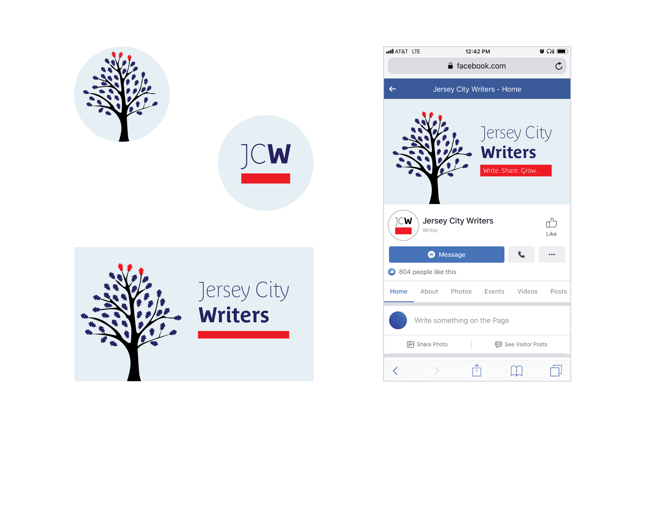 The third option drew inspiration from New Jersey’s state tree, the red oak. The trunk symbolized growth, while the branches and leaves represented the many genres of writing. Three red leaves stood for the group’s motto: Write. Share. Grow. A red line connected the tree symbol to the JCW logotype, tying the system together.