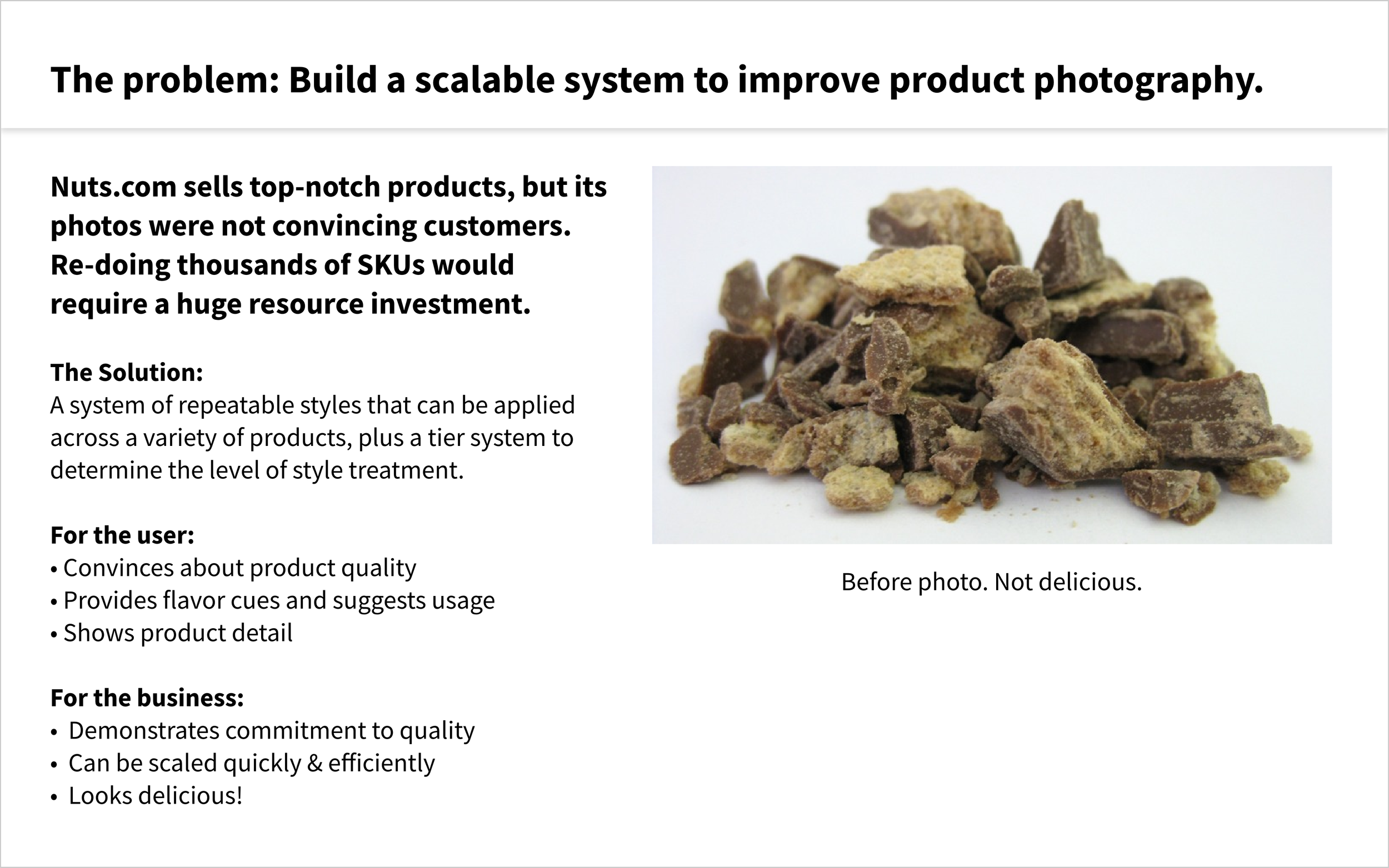 Summary: As Design Director for Nuts.com, I implemented a high-volume photography system, with a professional team and equipment.
