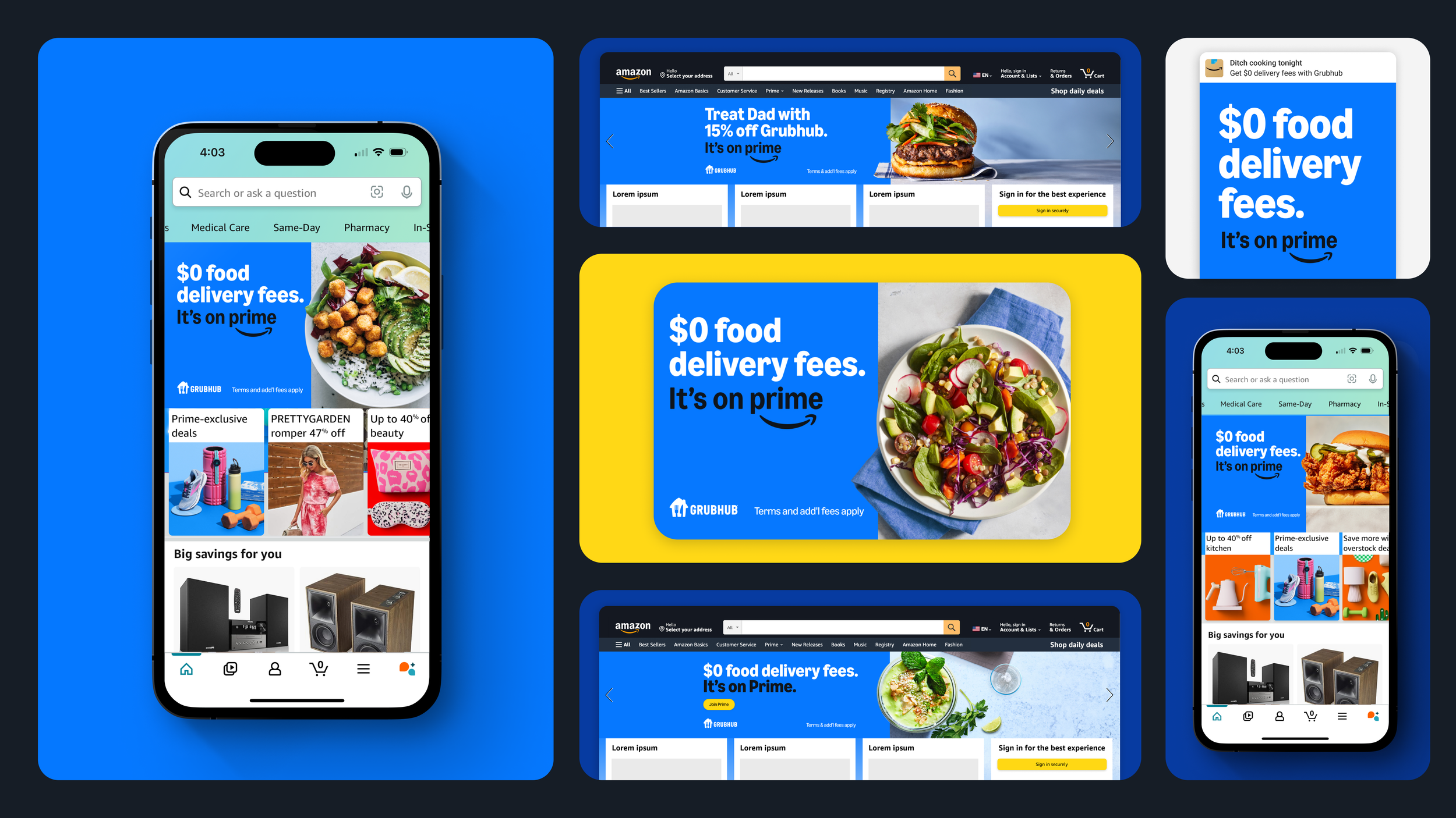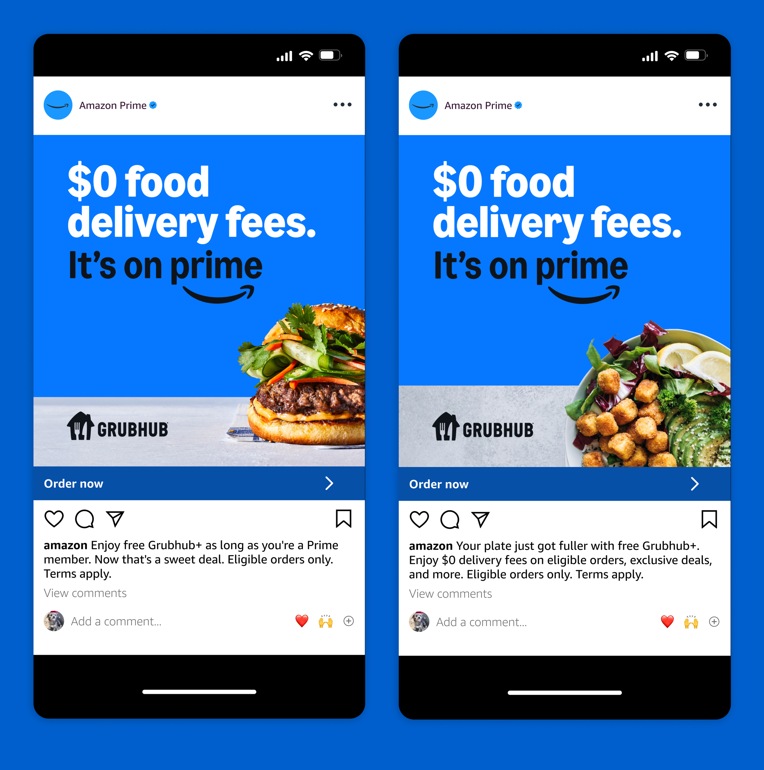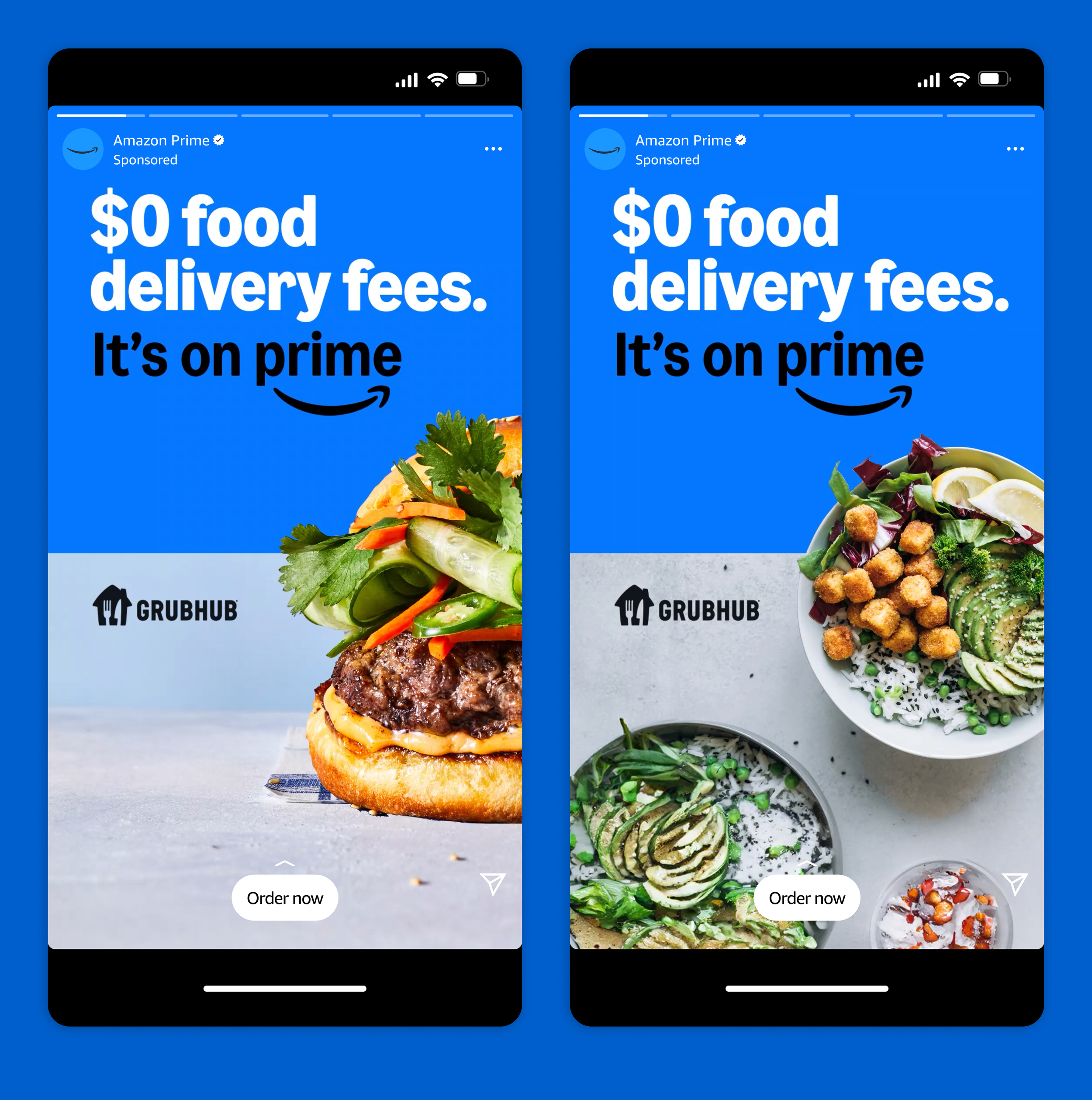 Brief: Promote a new product feature that allows Prime members to link their account with Grubhub. Build on the insight that customers are more interested in free delivery than product features.