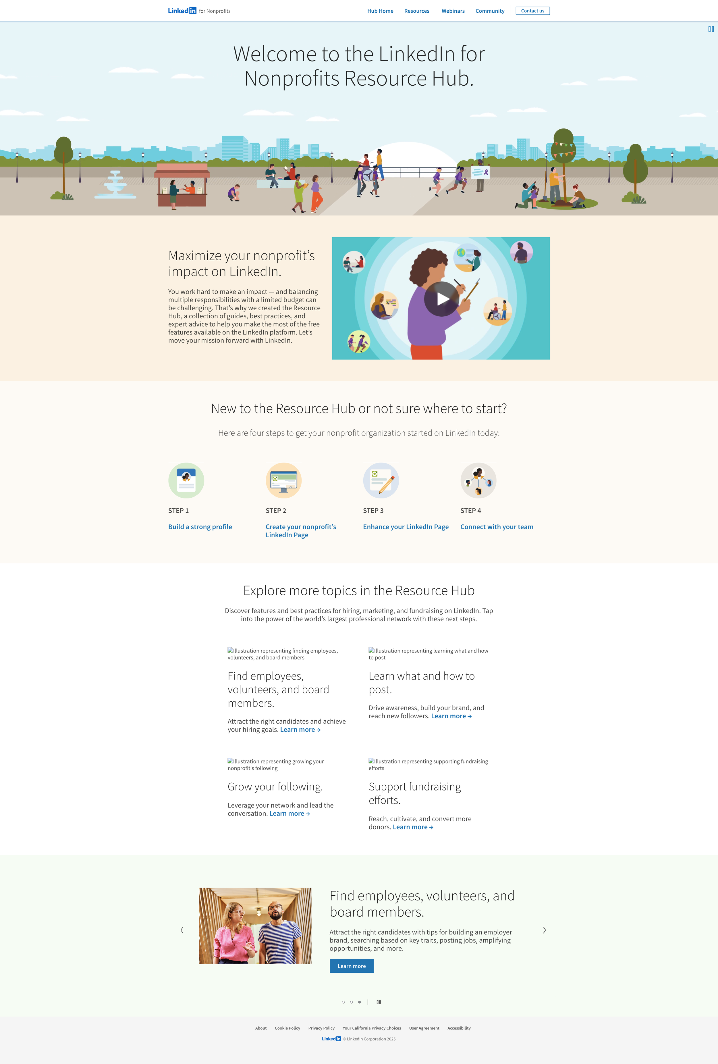 Approach: This project unified all of LinkedIn’s nonprofit tools and resources into one central hub. Custom illustrations established a friendly vibe and videos guided users through the site. I created the initial concepts for client approval, made the hero illustrations and directed the team through finished assets.